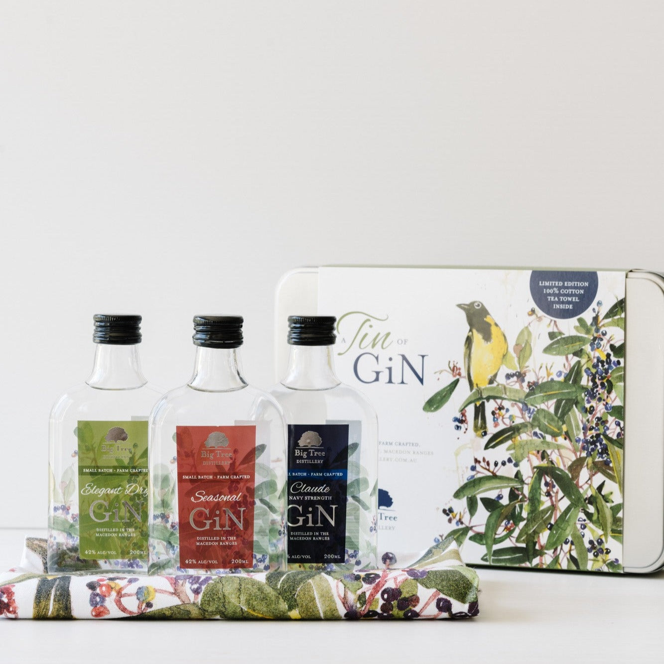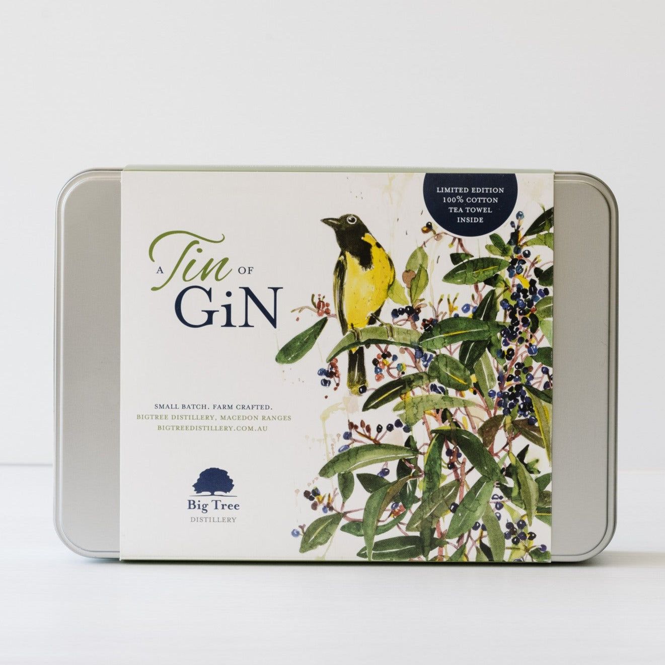 - Plus your Gin tin is all packaged up with a beautifully illustrated limited edition 100% cotton tea towel featuring New Holland Honey Eaters and Tasmanian Pepper Berry by local Macedon Ranges artist Sarah Gabriel.
